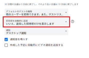 Googleカレンダーの設定>予定の設定 の下記箇所を【いいえ、返信した招待状だけを表示します】に変更します。